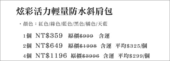 商品訊息簡述: 平均每個最低只要299元起(含運)即可購得炫彩活力輕量防水斜肩包1個/2個/4個,顏色:紅色/綠色/藍色/黑色/橘色/天藍。